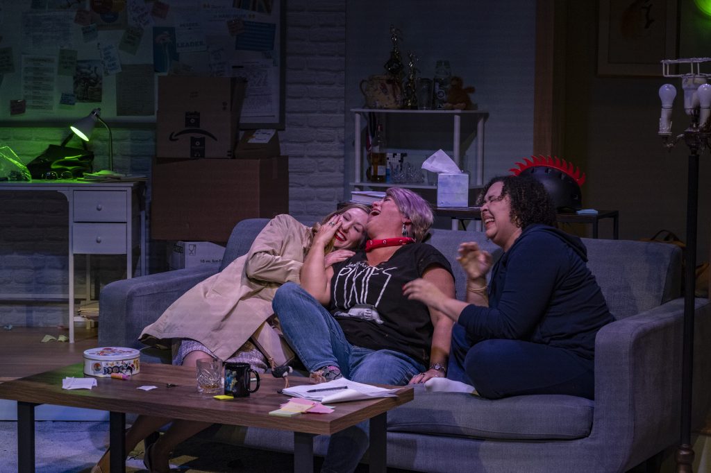 Murray’s well-constructed script has ebbs and flows, and the discoveries are logical – while the physical element is farce, the dialogue is rich in compassion and wit — and candor. At a time when fear of others is rampant, it’s refreshing to see three very different women learn about each other and overcome prejudice.