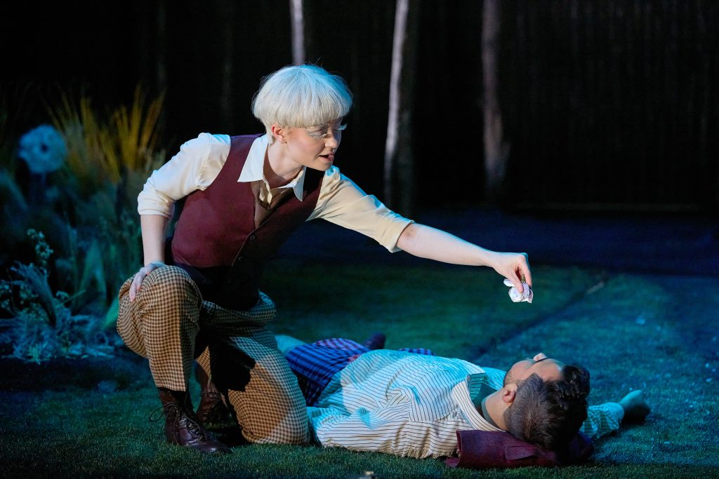 Puck (Matisse Carmack) lays a spell upon a sleeping Lysander (Anthony León) in A Midsummer Night’s Dream. Photo © Eric Woolsey