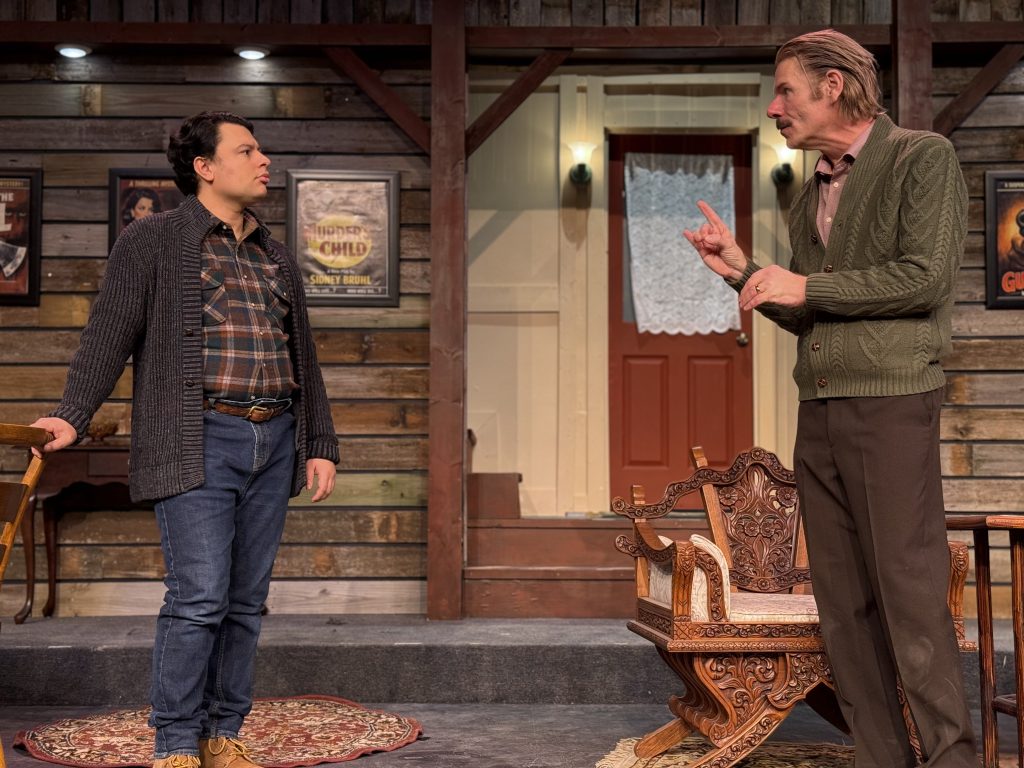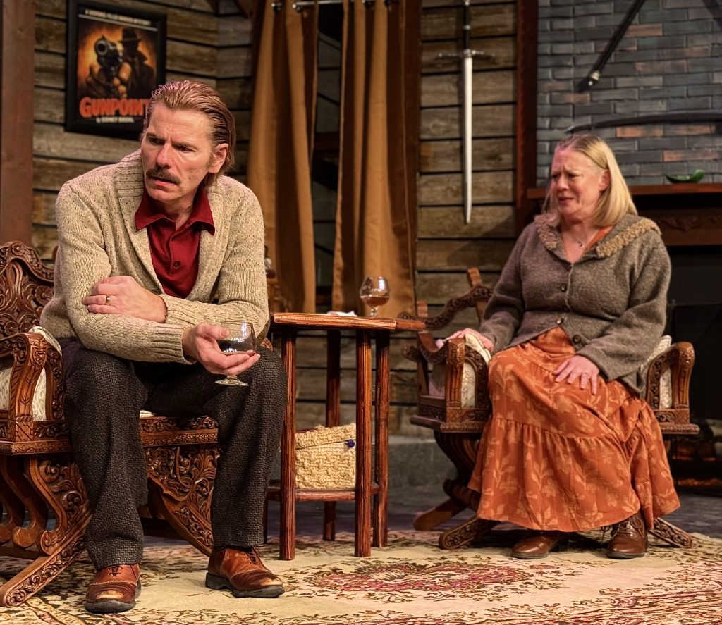 The technical elements are superb, providing an unsettling atmosphere for the disturbing behavior about to happen. Rob Lippert’s striking scenic design makes the bad vibes come alive — a rustic study renovated from a stable, with framed theatrical ‘window cards’ that are Bruhl’s greatest hits and reflect classic film noir posters.