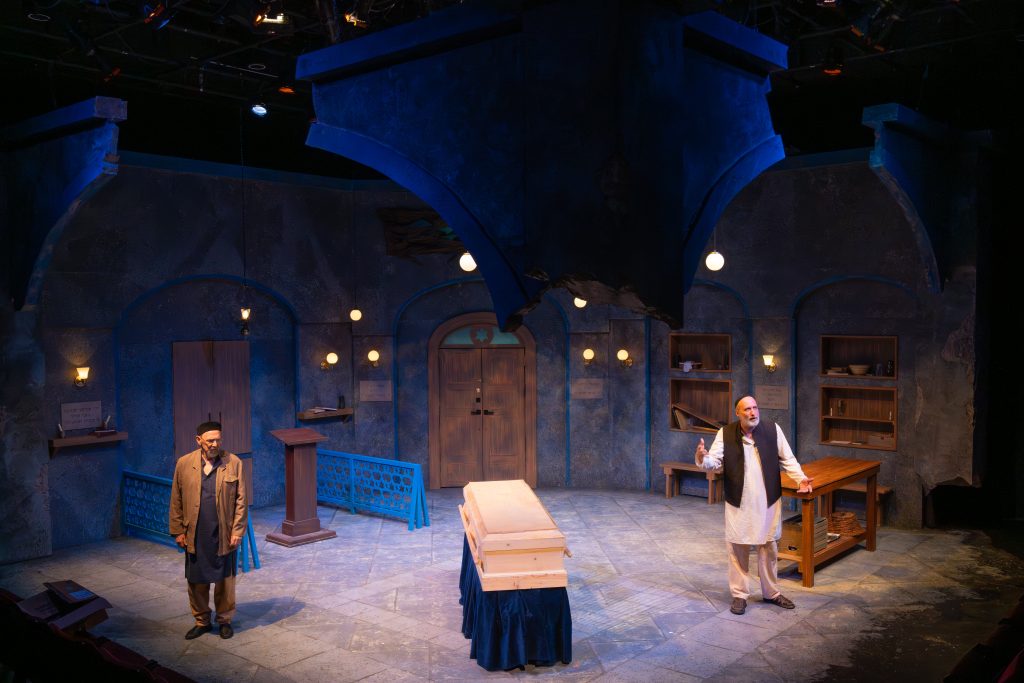 The New Jewish Theatre’s polished production benefits from veteran actors Gary Glasgow as Ishaq and Chuck Winning as Zeblyan, showcasing their sharp comedic timing, enhanced by the company’s impeccable technical work.