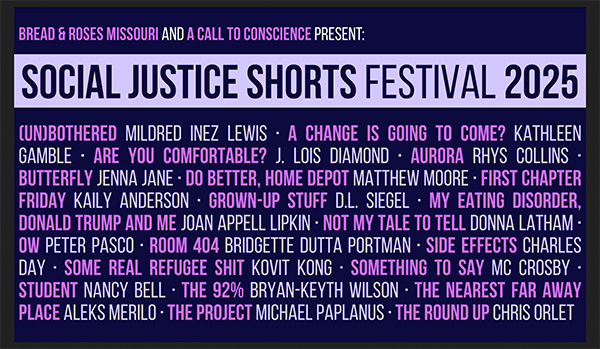 “We were amazed to have over 180 submissions from writers all over the country. We’re excited to be inviting local directors and actors to bring these powerful theater pieces to life in the cause of justice,” says Emily Kohring, Executive Director of Bread and Roses Missouri. Support for Social Justice Shorts 2025 is provided by the St. Louis Regional Arts Commission and the Whitaker Foundation.