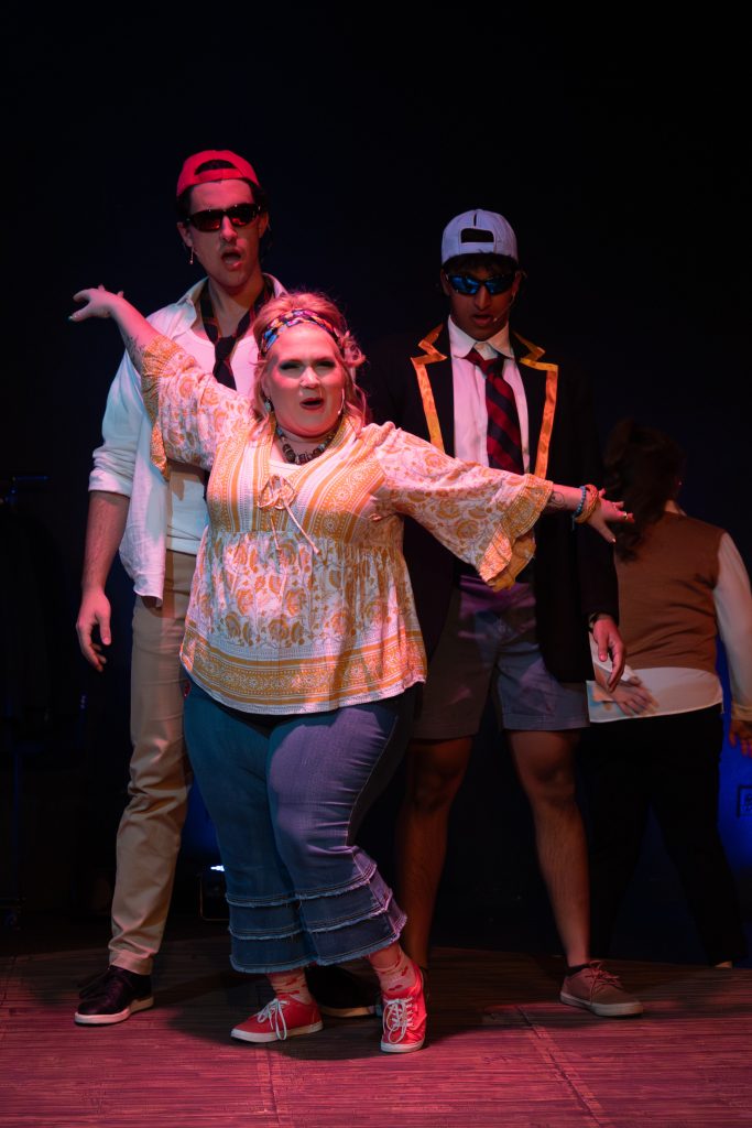 The Greek Chorus of Delta Nu sorority sisters is sprightly support – Natalie Sannes as energetic Serena, Lillie Self-Miller as chipper Margot, and Evan Lee as sassy Pilar, starting off with the cheery “Omigod You Guys” and being Elle’s sounding board.